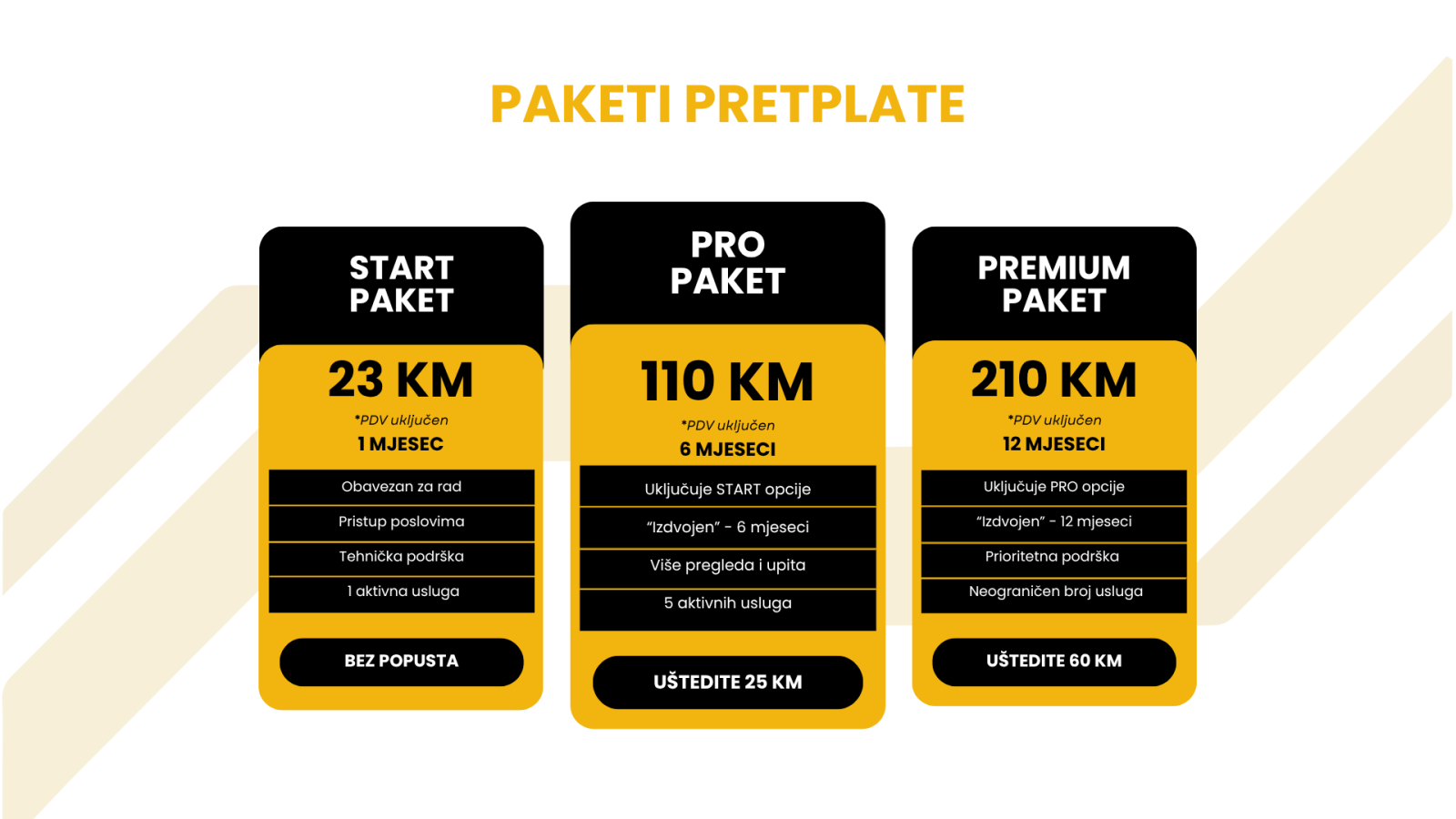 Za korištenje aplikacije dostupni su pretplatnički paketi – mjesečni, polugodišnji i godišnji. Što duži paket odaberete, to ostvarujete veći popust. Paketi vam omogućavaju puni pristup platformi, komuniciranje s klijentima i oglašavanje vaših usluga. Detaljne informacije o načinu rada platforme, plaćanjima i naknadama dobijate kroz info brošuru nakon registracije.